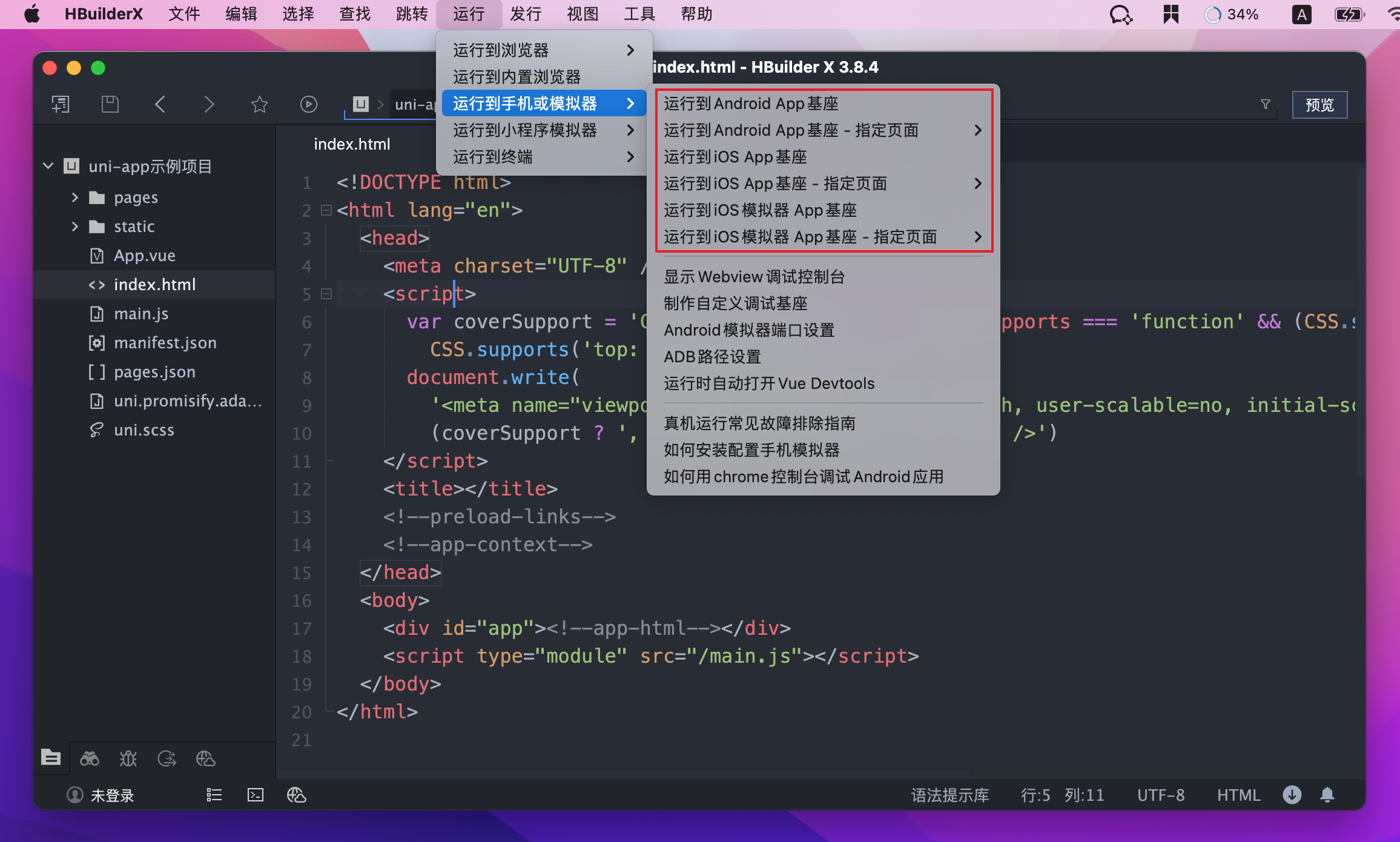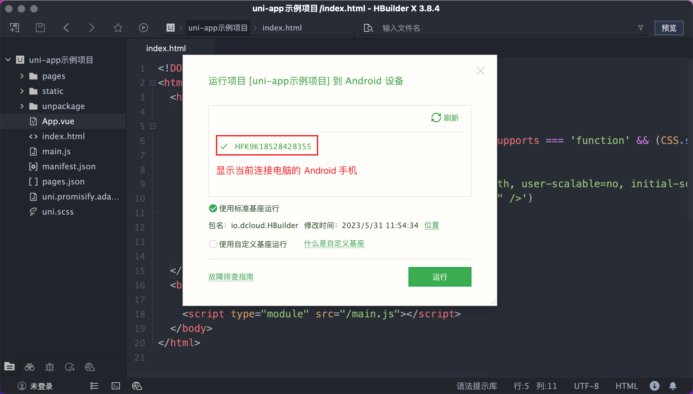 以上的步骤都是准备工作,接下来回到 HBuilder X 中,选择【运行】=>【运行到 Android App 基座】