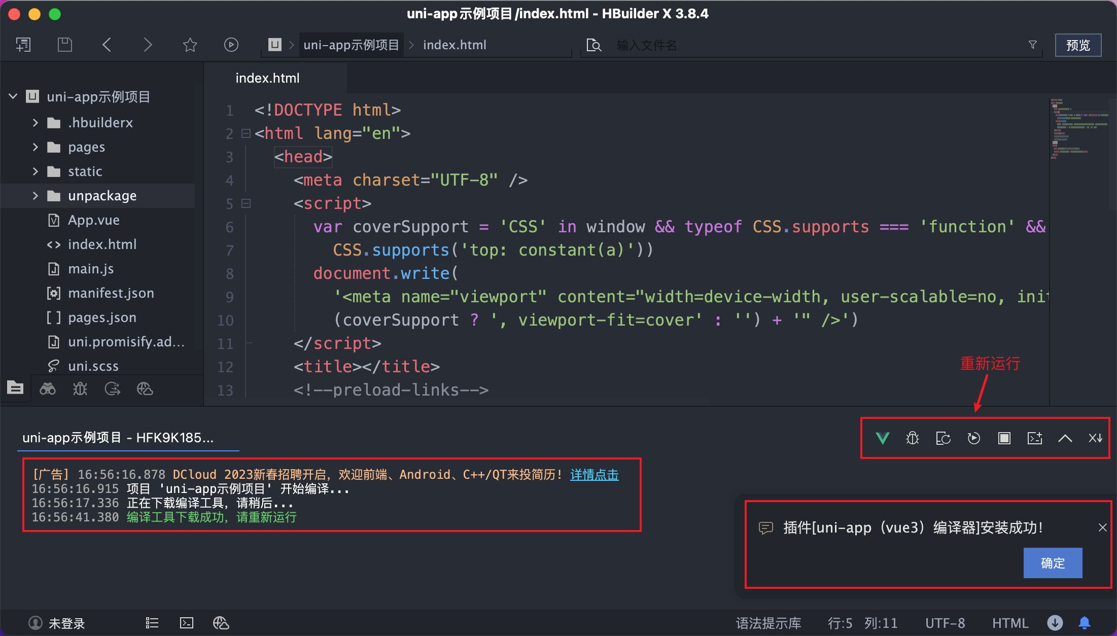 首次在 App 中运行时还会自动安装【uni-app(Vue3)编译器】,安装完毕后【重新运行】就可以在手机中运行 uni-app 项目了。