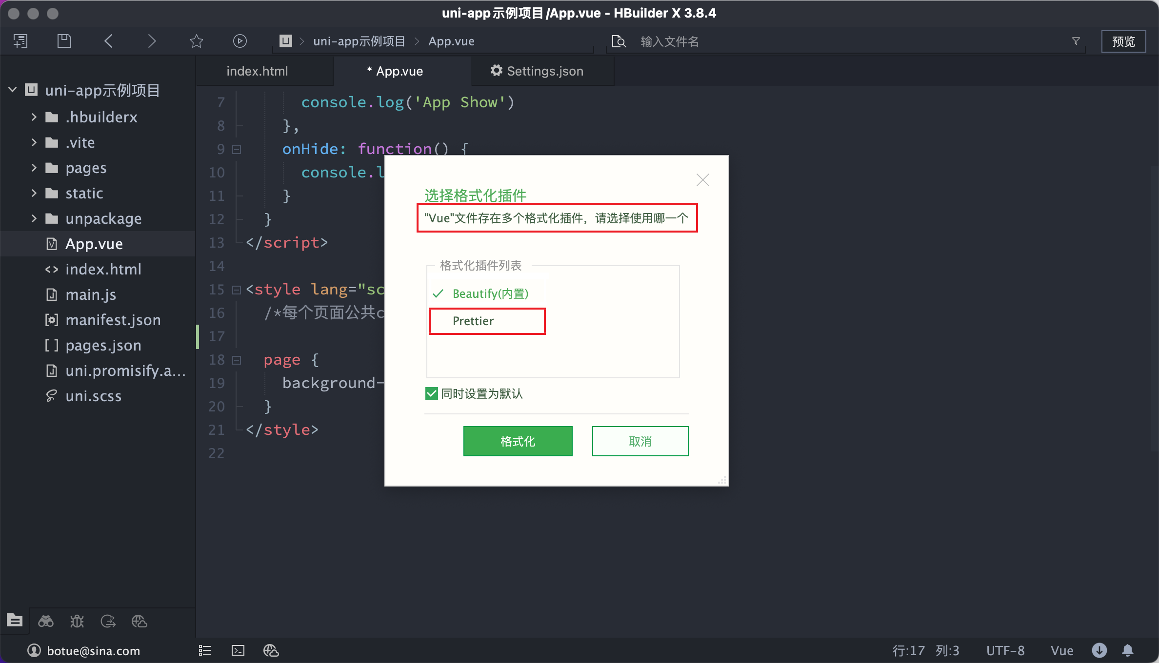 当配置了【保存自动格式】时,会自动的根据插件来进行代码格式化的处理,由于我们安装了 Prettier 插件,所以此时 HBuilder X 会提示我们是否要选择使用 Prettier 来格式化代码。